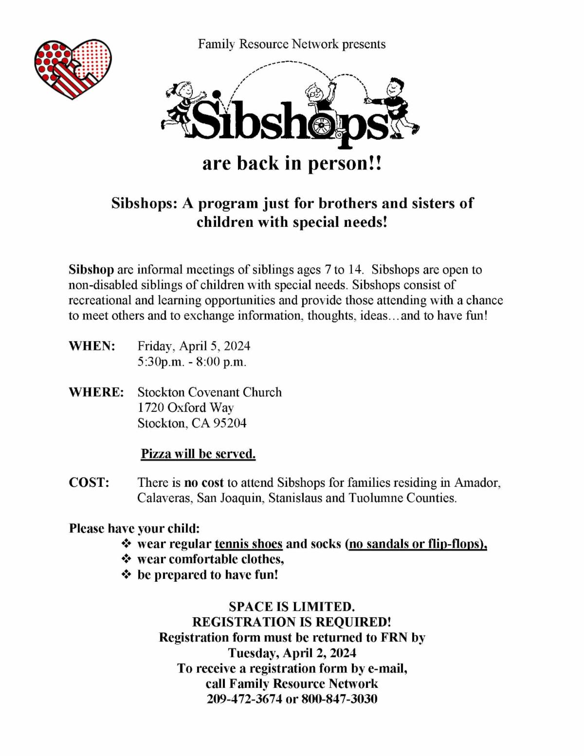 Family Resource Network (FRN) is hosting Sibshops in San Joaquin County on Friday, April 5, 2024. Sibshops are informal meetings of siblings ages 7 to 14, and are open to non-disabled siblings of children with special needs and disabilities. Sibshops consist of recreational and learning opportunities and provide those attending with a chance to meet others and to exchange information, thoughts, ideas…and to have fun!