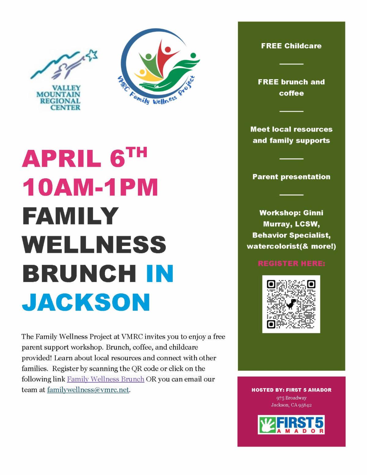 We are bringing our Family Wellness Brunch at Jackson! You learn from other parents, a keynote speaker, and community resources, with free brunch, coffee, and childcare. We plan on doing this quarterly and this is the first time it will be at Amador County! It will be on April 6th, Saturday, from 10 am to 1 pm. This will be held at the First 5 Amador, 975 Broadway, Jackson, CA 95642. Click the QR code on the flyer below to register, or click this link: