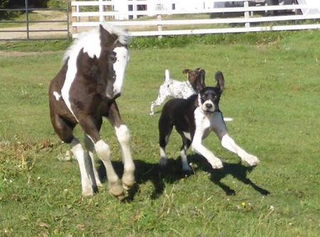 Include the registered name and registration number of the horse(s), the name(s) of any people in the photo and information about the other animal(s) in the photograph.