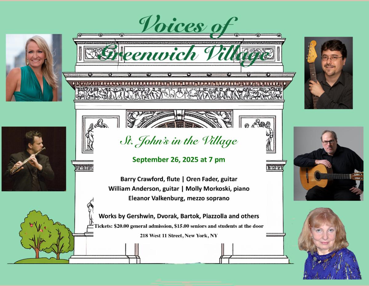 “Village Voices” tells powerful stories of our everyday lives. Baritone James Martin with instrumentalists Lynn Raley, William Kentner Anderson and Michael Cameron perform songs by Village artists, including premieres by Maria Thompson Corley, Carman Moore, and the legendary David Amram.