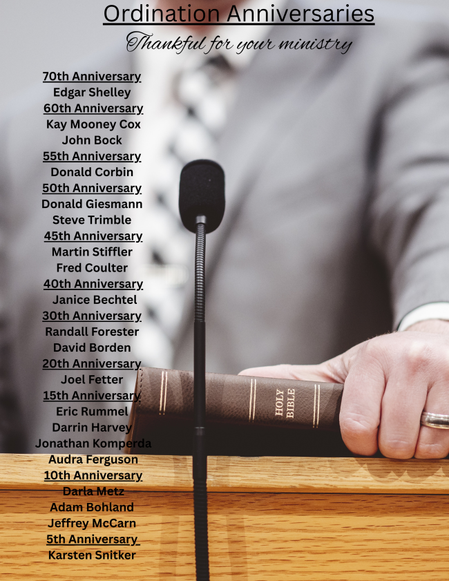 Continuing prayer for: Dee Schroer, Rev. Daniel Johnson, Rev. Jim Garner, Rev. Don Corbin, Rev. Randall Forester, Rev. Gale Gebhart, Rev. Don Giesmann, Rev. David Culp, Peggy George, Rev. Diane Christopherson, Rev. Patrick McKinney, Regena Mummert, Rev. Mike Ebersole, Susan Bishop, Rev. Diane Thomas, Rev. Jeanette Tangeman, David Weininger is in the hospital.