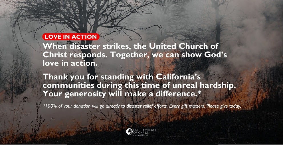 Many of us have the folks affected by the California wildfires on our hearts and minds. With 27 confirmed deaths, dozens more missing, over 45 square miles burnt, and tens of thousands under evacuation orders, the question of “How can we help?” is one that our Heartland Conference Disaster Response Team often hears. Another question that is often asked is, “Has it affected any of our UCC churches and members?