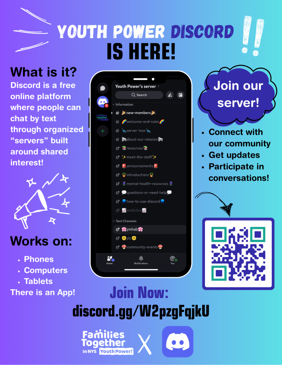 Our Youth Power server is a space created by and for youth and young adults to build community, share resources, and stay connected with what’s happening in the Youth Power Department at Families Together in NYS.