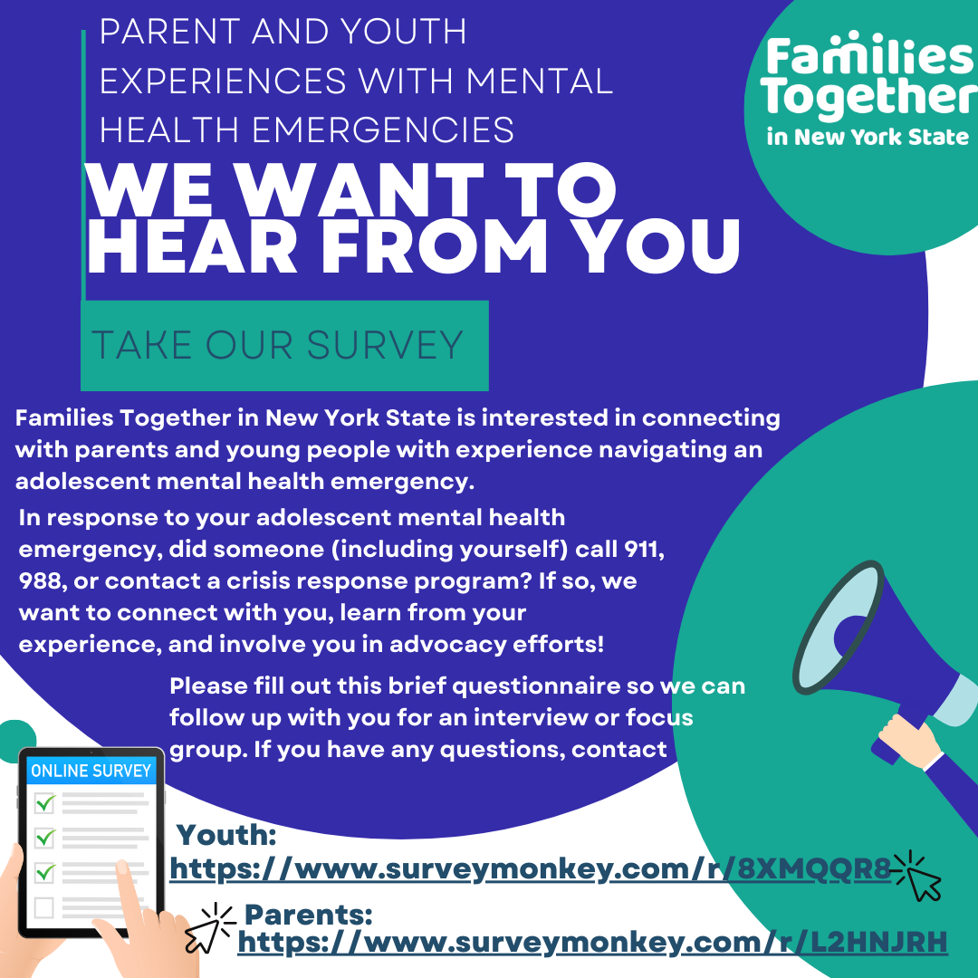Families Together in New York State is interested in connecting with parents and young people with experience navigating an adolescent mental health emergency.
