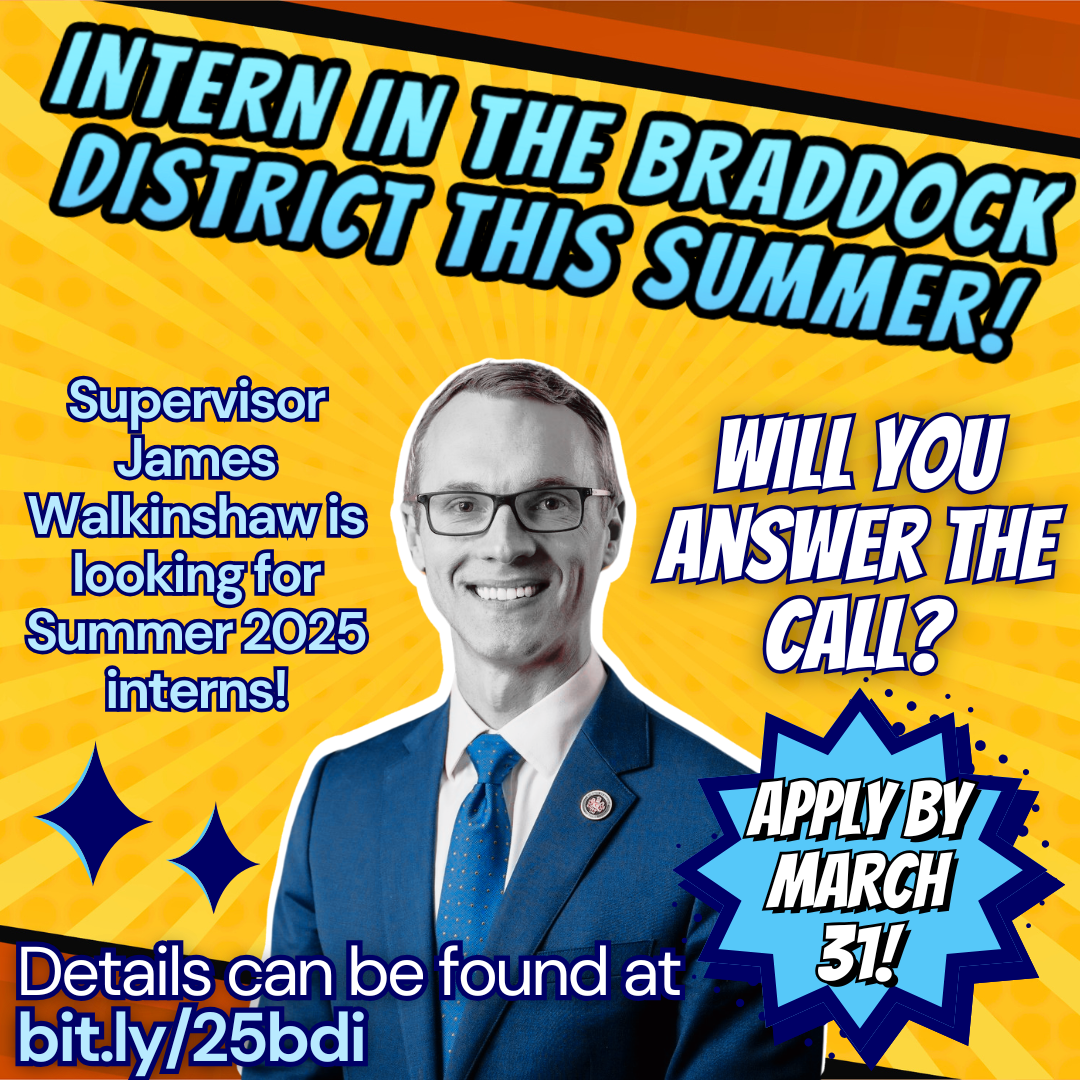 Supervisor Walkinshaw's office is accepting applications for a paid summer internship. College students residing in or from the Braddock District are encouraged to apply.
