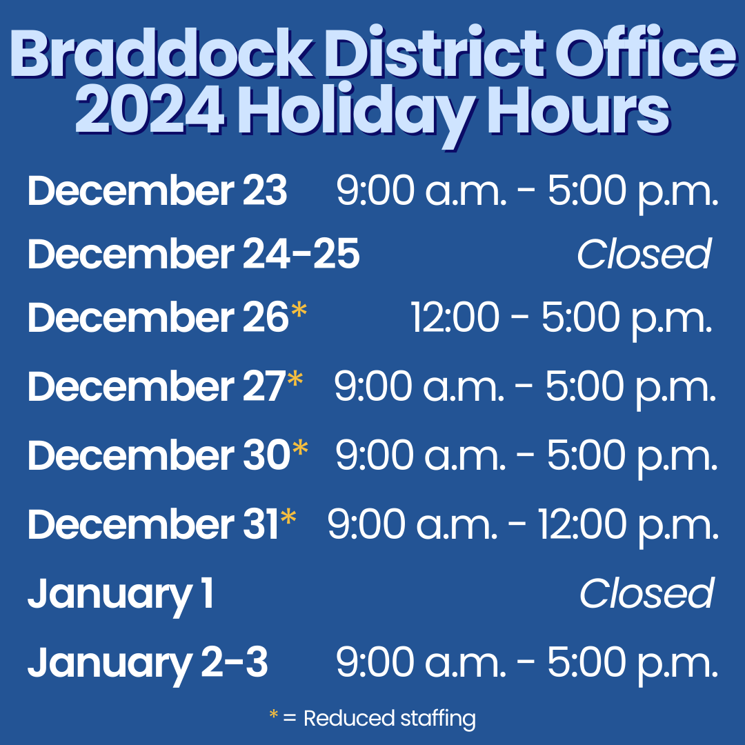 As we celebrate the holiday season, the Braddock District Office will be operating with reduced staffing and may not be able to fulfill all walk-in requests.