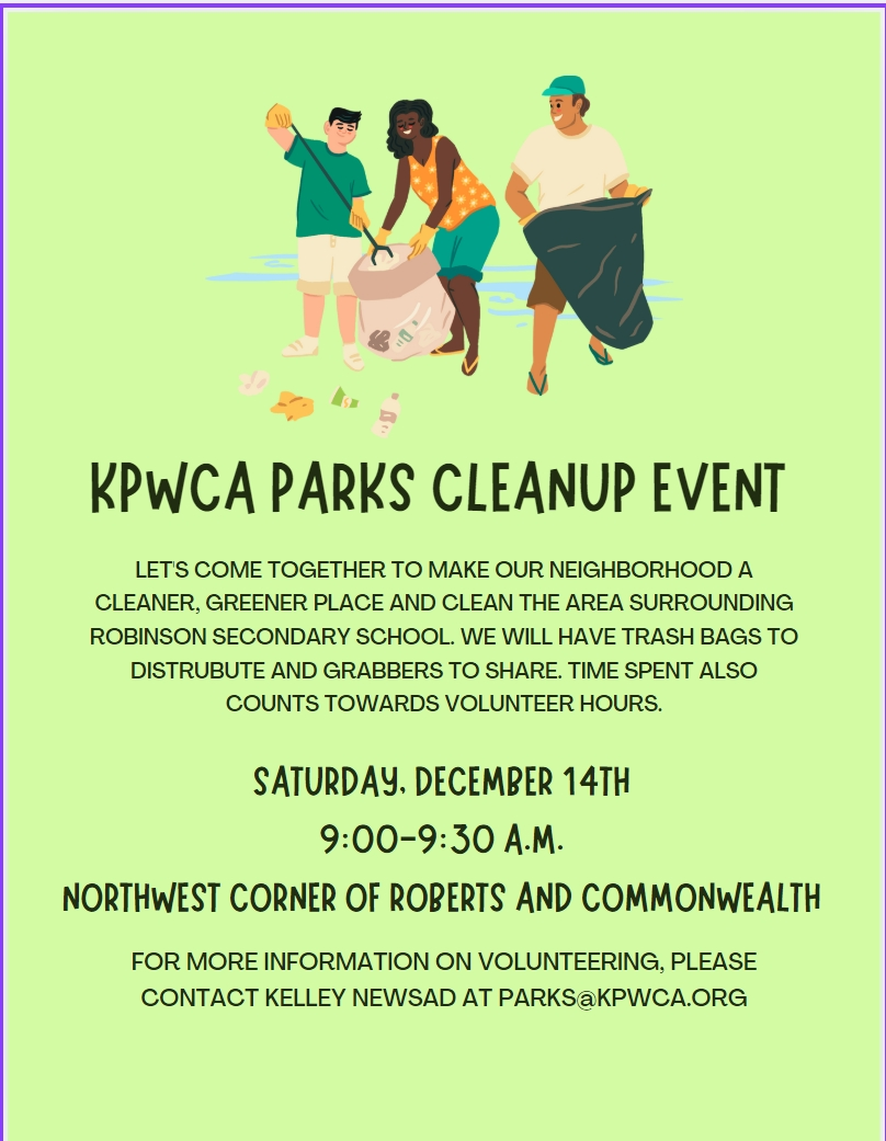 The Kings Park West Civic Association will host a cleanup event on Saturday, December 14, from 9:00 - 9:30 a.m., beginning at the northwest corner of Roberts Road and Commonwealth Boulevard.