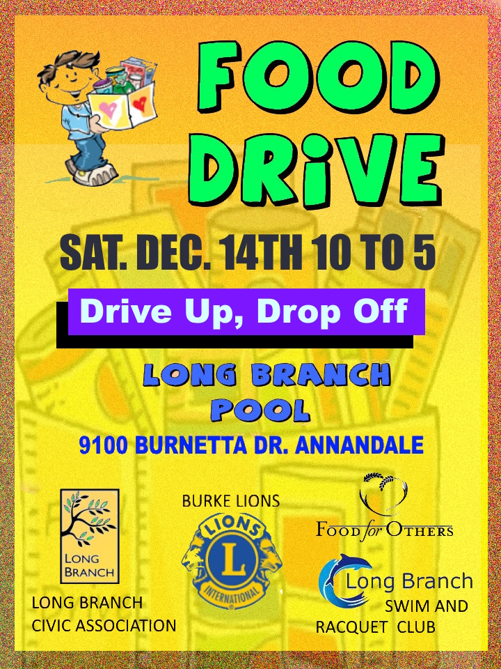 The Greater Long Branch Community's Annual Food Drive is this Saturday, 14 December, from 10:00 a.m. - 5:00 p.m. at the Long Branch Swim & Racquet Club (9100 Burnetta Drive, Annandale).