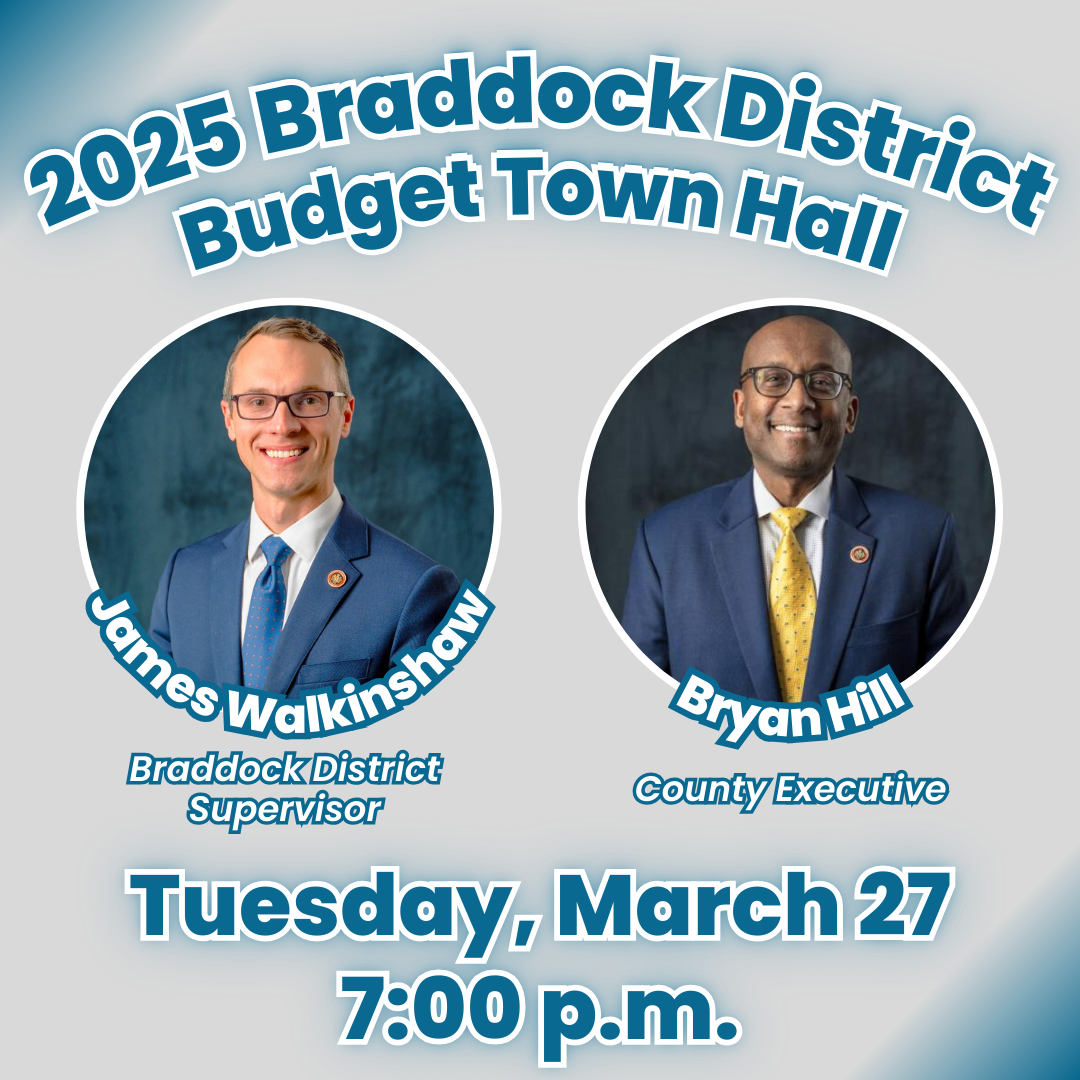 The Braddock District Budget Town Hall is on Thursday, March 27, at 7:00 p.m. with Braddock District Supervisor James Walkinshaw and County Executive Bryan Hill. The new date was announced in last week's Braddock Beacon.