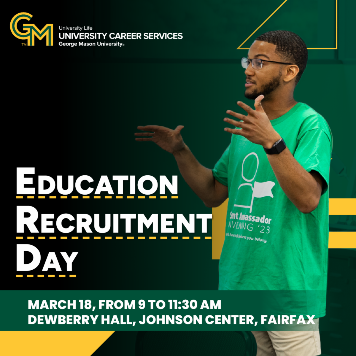 Over 50 employers will attend the Education Recruitment Day on March 18 from 9:00 - 11:30 a.m. at George Mason University’s Dewberry Hall (4400 University Drive, Fairfax) to recruit candidates for teaching, counseling, social work, and other positions.