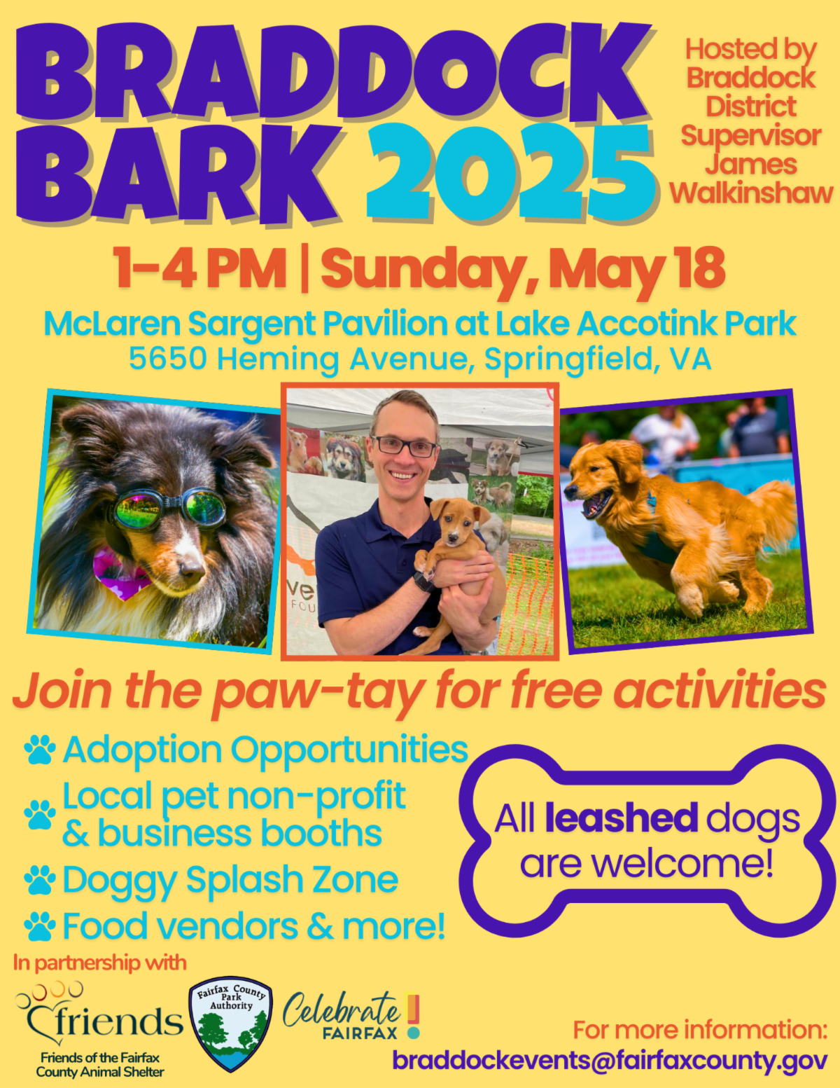 The Braddock District's most popular event of the year is coming up! The 4th Annual Braddock Bark Dog Festival is on Sunday, May 18, from 1:00 - 4:00 p.m. at the McLaren-Sargent Shelter at Lake Accotink Park (5650 Heming Avenue, Springfield).