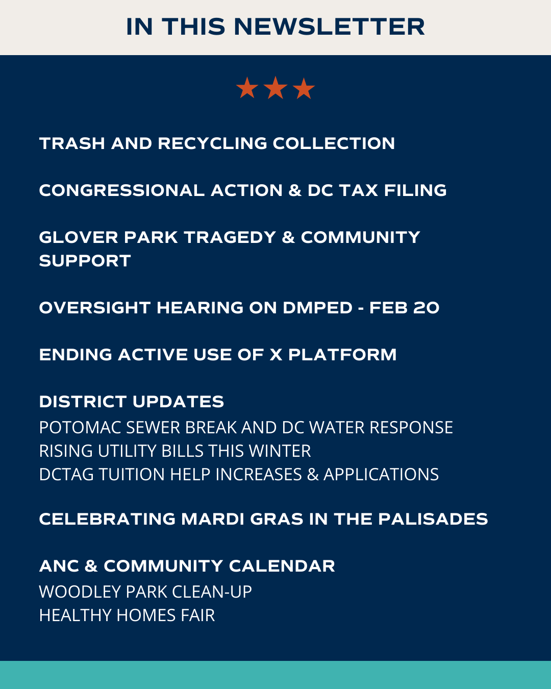 Below, you will find updates on these issues and others affecting Ward 3, including rising utility bills and available assistance, performance oversight hearings, DC Tuition Assistance Grant increases, community events, and opportunities to engage with local government.