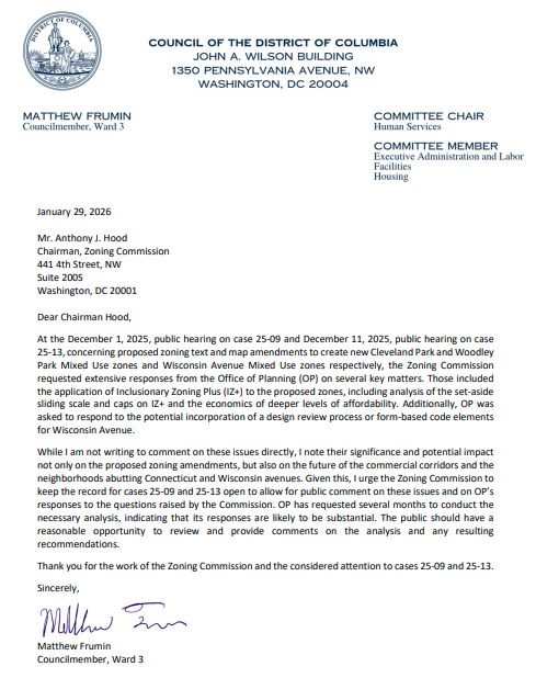 Last week, I sent a letter to the Zoning Commission about two rezoning cases for Ward 3. These cases involve proposed changes for Cleveland Park, Woodley Park, and Wisconsin Avenue.