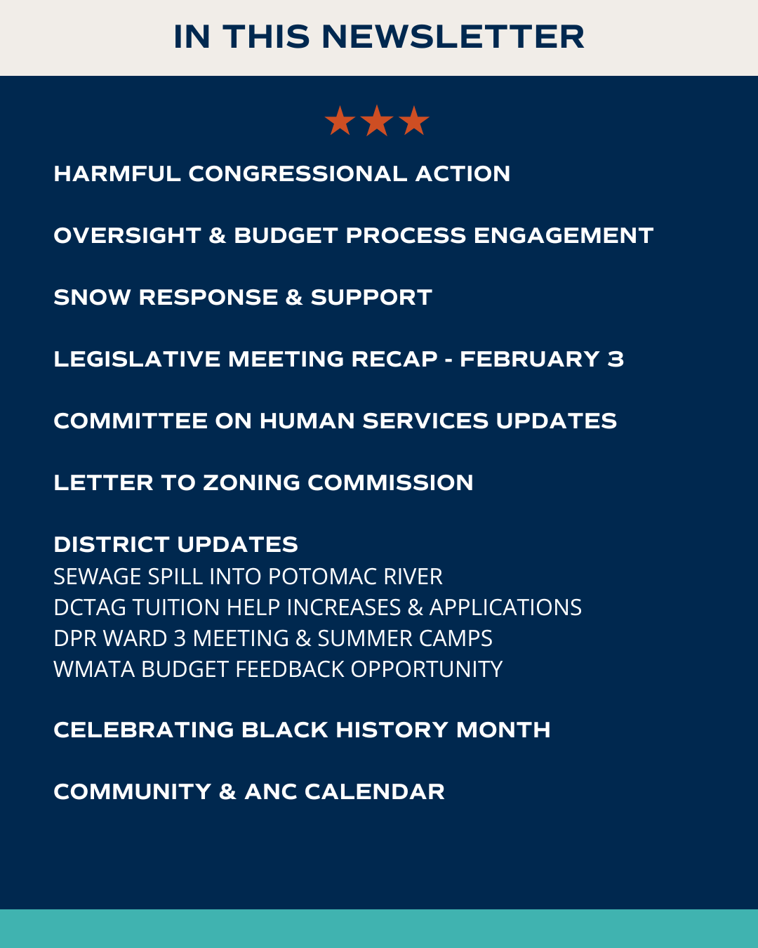 In this newsletter, I share more detail on what Congressional action on decoupling means for DC and why it matters for Home Rule. I also share more information and resources on the snow response. Residents can also read about my recent Ward 3 FY27 Budget Listening session, the February 3 legislative meeting, a bill I co-introduced to get more child support funds directly to families, and my recent letter to the Zoning Commission regarding Ward 3 zoning cases.