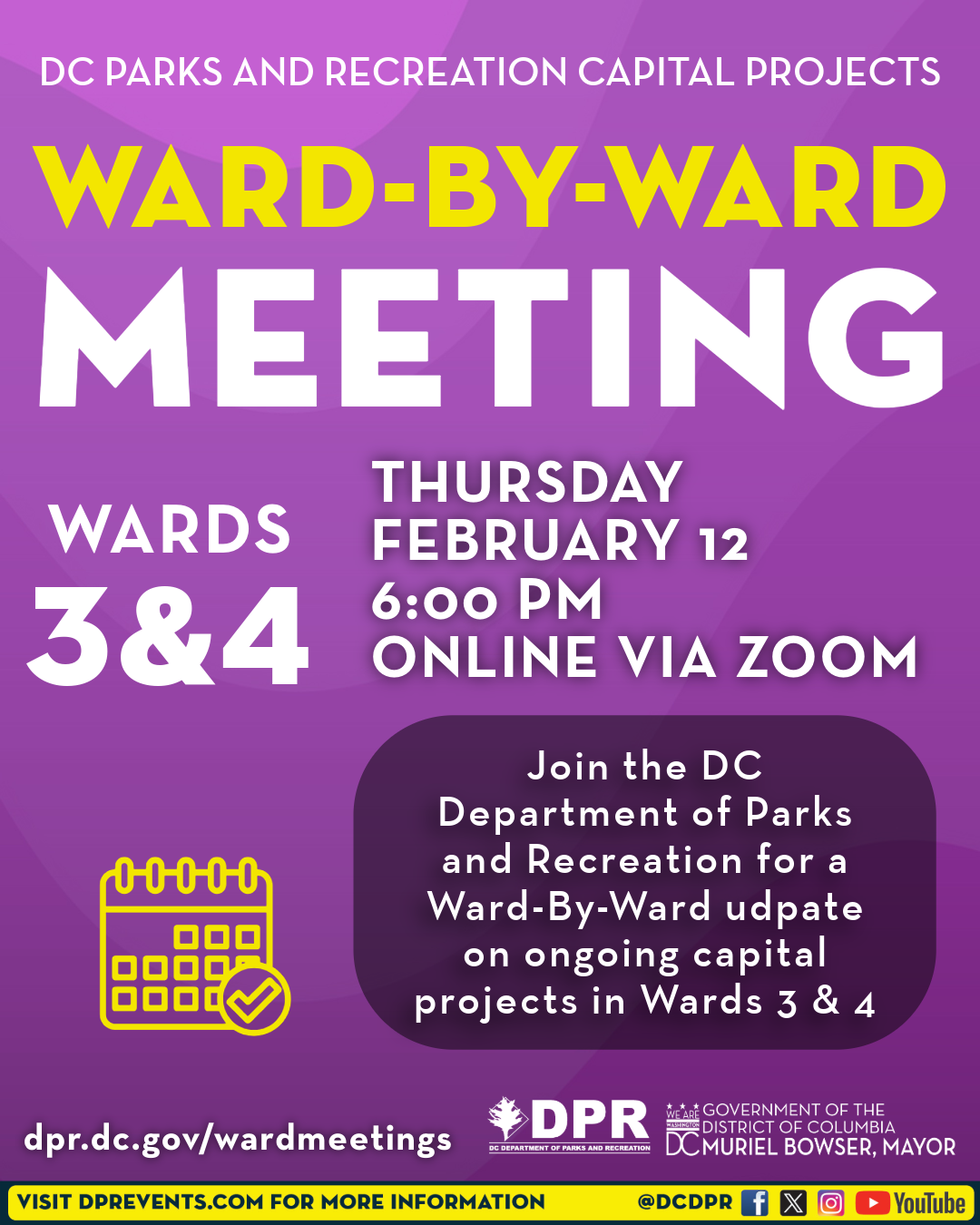 The Department of Parks and Recreation (DPR) will host a virtual meeting to discuss new construction projects in Wards 3 and 4. The meeting is on Thursday, February 12, at 6:00 p.m. Your feedback helps DPR build better spaces for our community. RSVP online here.