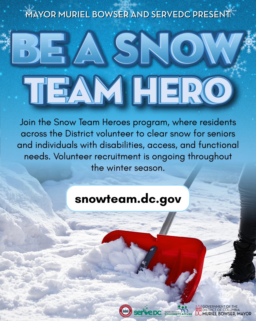 | | The District’s Snow Team Heroes program connects volunteers with seniors and residents with disabilities or access and functional needs who need assistance after snowfall. Volunteers are matched with nearby residents and provided with supplies. Learn more and sign up at snowteam.dc.gov. | | |