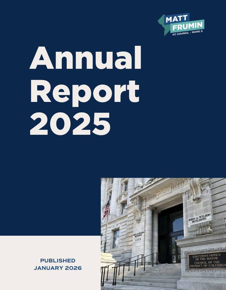 Hearings are held at the Wilson Building, 1350 Pennsylvania Avenue NW. Residents can sign up here to testify during an upcoming committee hearing. Residents can also search for legislation here, and watch committee hearings on my YouTube Channel, @CMFrumin. More information about the committee can be found on my website at mattfruminward3.com/committee.