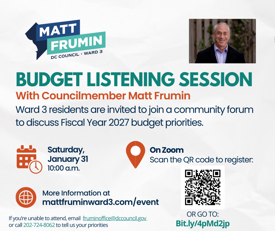 The Council is preparing for annual performance oversight and the Fiscal Year 2027 (FY27) budget process. I want to hear from you about your priorities for how the District invests in the programs that impact you most. Ward 3 residents are invited to join me for my annual budget listening session to share their thoughts and ask questions regarding the upcoming budget. The listening session will be held on Saturday, January 31, 2026, at 10:00 a.m. on Zoom.