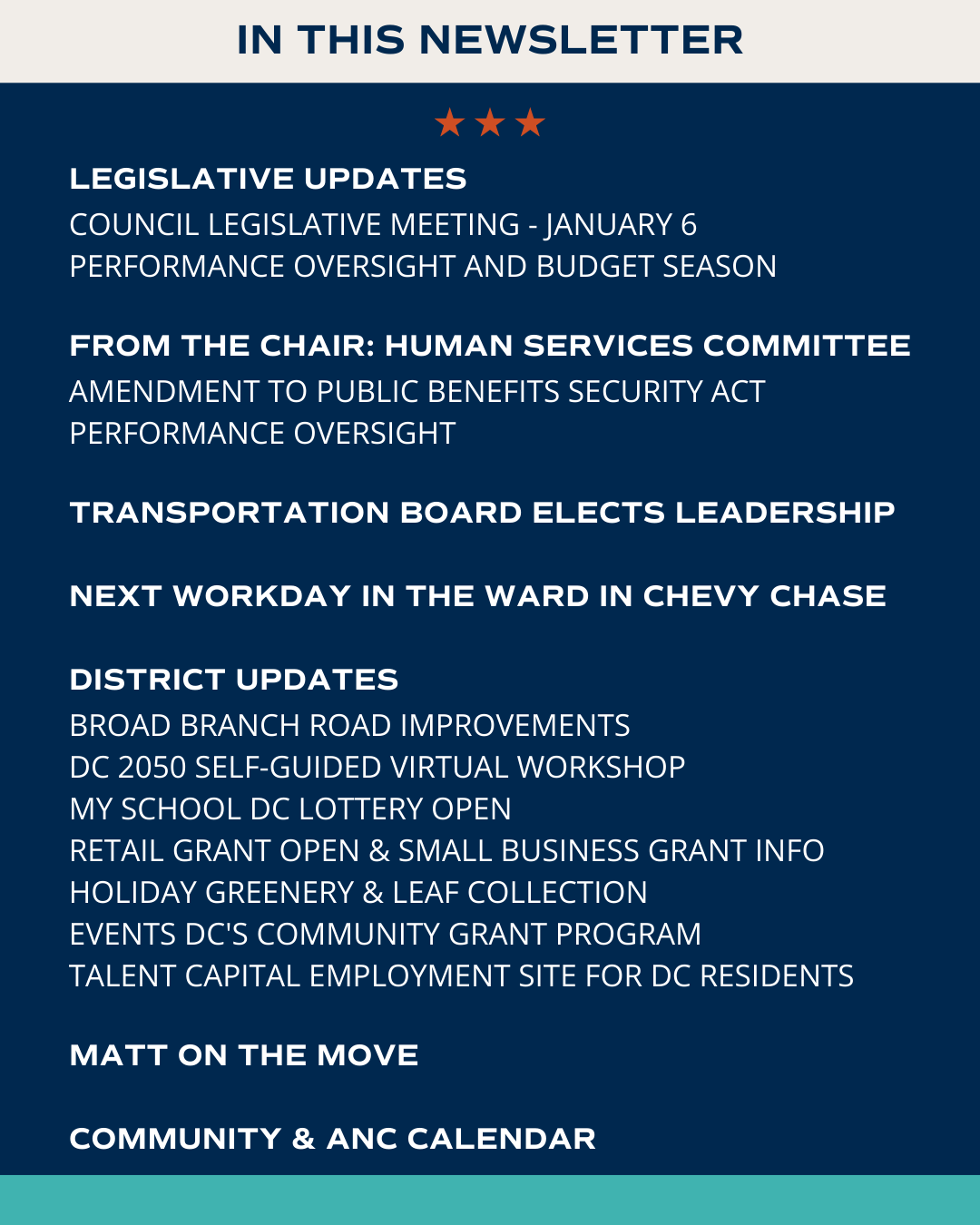 | | REGIONAL TRANSPORTATION BOARD ELECTS LEADERSHIP FOR 2026 | | In December, the National Capital Region Transportation Planning Board (TPB) elected its leadership for 2026, with Gaithersburg Councilmember Neil Harris serving as chair. I was elected to serve as Second Vice Chair after serving as Third Vice Chair in 2025, a position in which Alexandria Councilmember Canek Aguirre will now serve. The TPB is part of the Metropolitan Washington Council of Governments (COG). The TPB brings together local, state, and federal partners to coordinate long-term transportation planning across the region, including work on safety, air quality, and multimodal travel. COG and the Metro board also recently endorsed the DMVMoves Task Force plan which recommends $460 million in new annual capital funding for Metro beginning in fiscal year 2028, along with steps to better align bus, rail, and fare systems across the region. This work underscores the importance of regional cooperation to maintain and modernize transit that District residents rely on every day. | | NEXT WORKDAY IN THE WARD IN CHEVY CHASE | | |