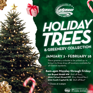 DPW’s holiday tree and greenery collection runs through February 28. Trees should be placed curbside or in tree boxes with all decorations removed. Collected materials will be turned into mulch as part of the District’s Zero Waste initiative. Drop-off locations are also available at Guy Mason Recreation Center, 3600 Calvert Street NW, 8:00 a.m. to 4:00 p.m. For more information on Holiday Reduce & Reuse Tips, please visit zerowaste.dc.gov/Holiday.