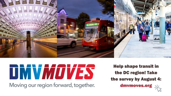 As part of the DMVMoves project, the Metropolitan Washington Council of Governments (COG) and WMATA are asking the public to complete a 10-minute survey so they can hear about your experiences using transportation in the DMV area. Your feedback will help them better understand and identify ways to improve transportation in your community. You can skip questions or choose to stop taking the survey at any time. Information you share will remain confidential. Complete the survey here. To learn more about DMVMoves, please visit dmvmoves.org
