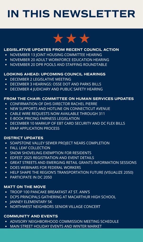 In this newsletter, you will find updates on housing including the ERAP application process, parks and recreation, public safety, access to e-books and audiobooks at DC Public Library (DCPL), and more. Thank you for the chance to do this work on your behalf.