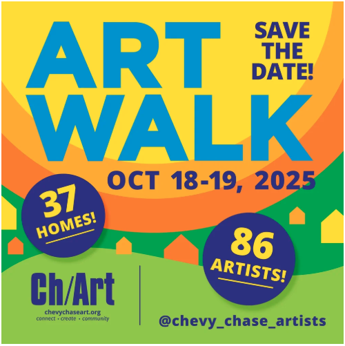 We’re just a month away from the Chevy Chase Art Walk. Every year, our community opens its doors to creativity, with 86 artists showcasing their work in 37 Chevy Chase homes. It’s a wonderful chance to explore our neighborhood, meet local artists, and support small businesses, all while enjoying a day full of art and inspiration. This year’s event will take place on October 18 and 19, from noon to 5:00 p.m. Learn more at chevychaseart.org/art-walk-2025-new.