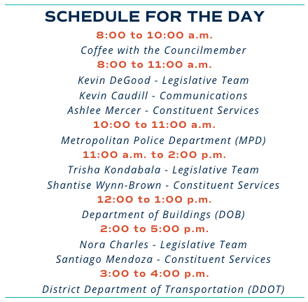 The schedule for the day is below. We’ll start the day with Coffee with the Councilmember from 8:00 to 10:00 a.m. This is an opportunity to sit down with me one-on-one and talk about issues that matter to you, whether it’s neighborhood concerns, city services, or legislative priorities. Throughout the day, members of my legislative, constituent services, and communications teams will be on site at various times to meet with residents and provide assistance. We’ll also have representatives from District government agencies joining us at different times to help answer questions and take service requests.