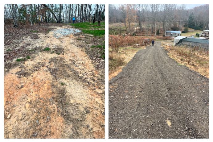 Before (left) and after (right) farm road stabilization projects at Calico Vineyard. | |