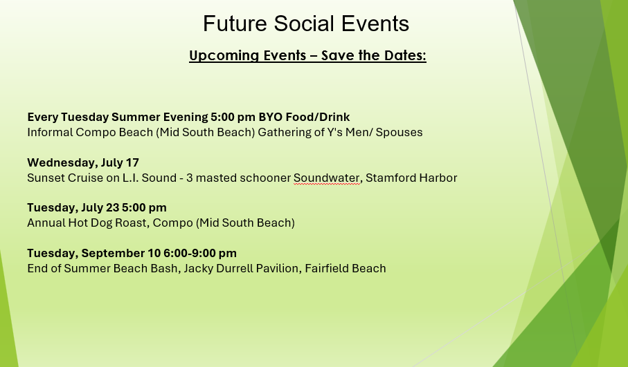 Arranged by Y's Man Jon Fox, the gatherings take place on South Beach "642 feet to the right of the cannons." There is no need for a beach sticker. Simply tell them at the entrance that you are attending the Y's Men picnic. It begins about 4:30 to 5:00 pm. Bring your own chairs, finger food and your choice of beverage perhaps to share (no glass containers are allowed).