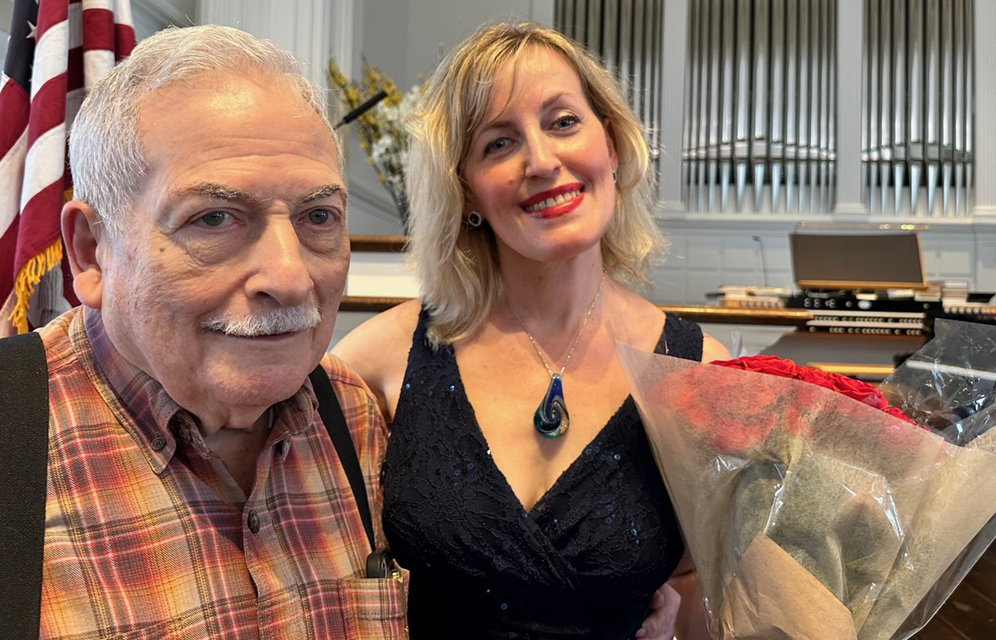 Following her sold out concert, Olga Vinokur receives a thank you bouquet of roses from Y’s Man benefactor Art Greenberg. | |
