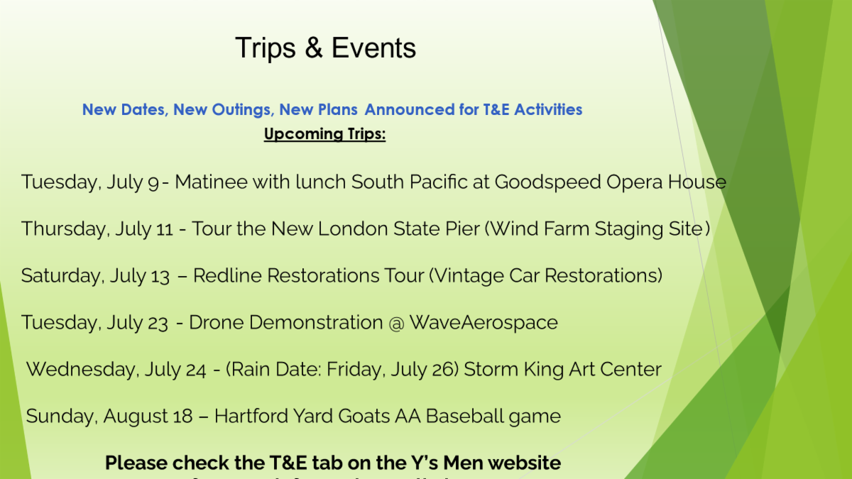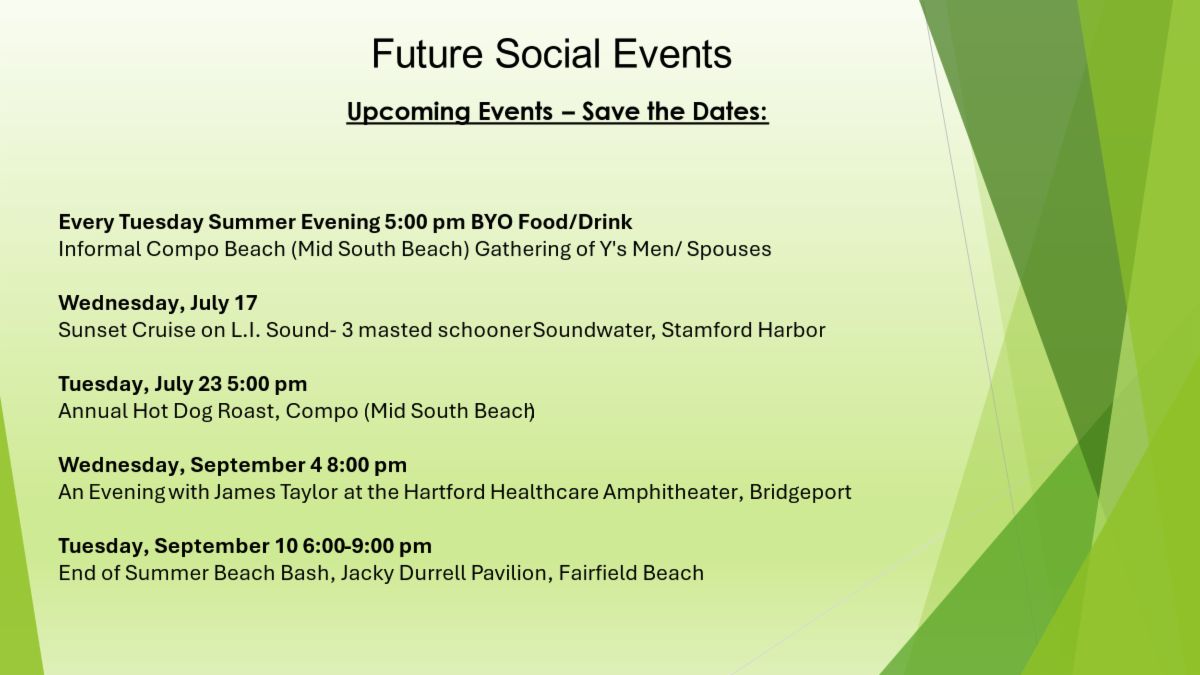 Videos of all 2024 meeting presentations are now available on the Y's Men website (ysmenwestportweston.org). Then click on the “Meeting Photos & Videos” tab. | |