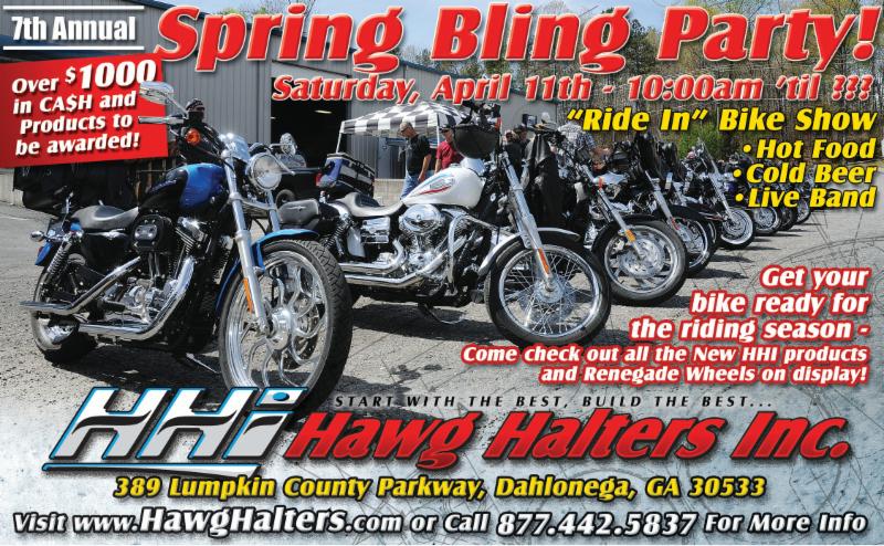 Apr. 11 Dawsonville, GA. Hawg Halters (HHI) Spring Bling Party. Starts 10am. "Ride In" Bike Show w/over $1000 in cash & products awarded. Hot food, cold beer & live band. See the new HHI products & Renegade Wheels on display. 389 Lumpkin County Pkwy. Call 877-442-5837 or visit HawgHalters.com.
