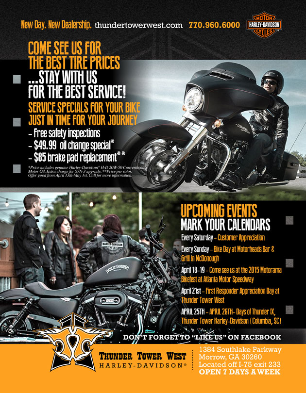Apr. 18 Lithia Springs, GA. Harley-Davidson of Atlanta Spring Open House & Demo Day. From 10am-4pm with demo rides, vendors, food, bouncy house and music from Sons N Britches. 501 Thornton Rd. Visit HDAtlanta.com.