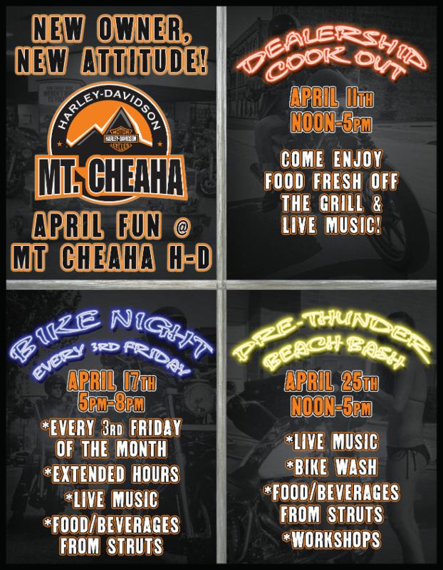 Apr. 17 Oxford, AL. Bike Night at Mt. Cheaha Harley-Davidson. From 5-8:00pm at 231 Davis Loop Road. Call 256-832-8888.