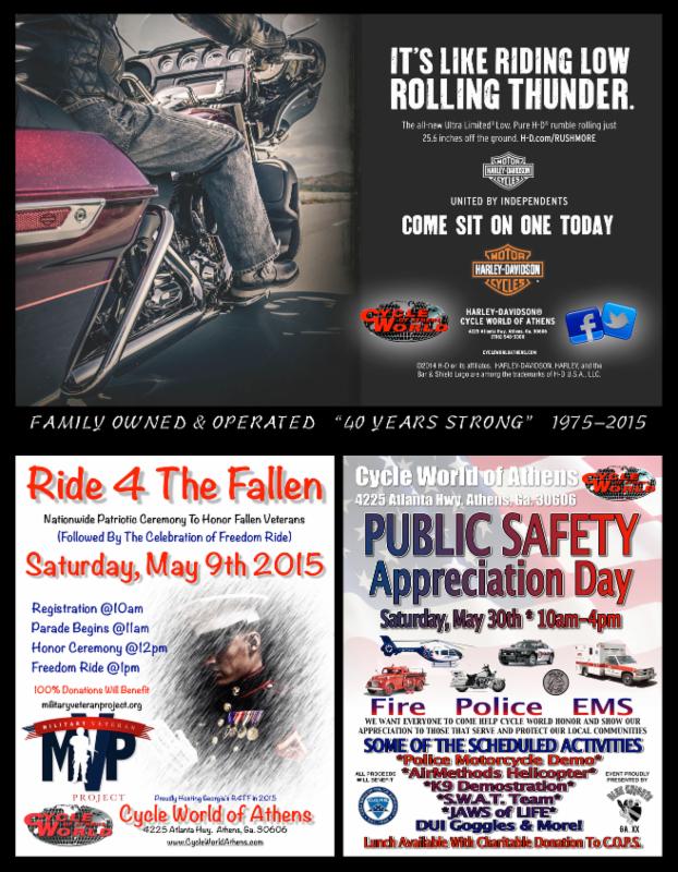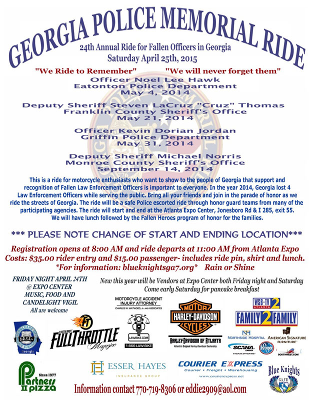 Apr. 18 Augusta, GA. Deputy J.D. Paugh Memorial Ride. Pre-register 8-10am at Augusta H-D, 4200 Belair Frontage Rd. Ride to Wild Wing Caf? for continued registration and 1pm ride. Concert following ride. Call 706-651-0444.