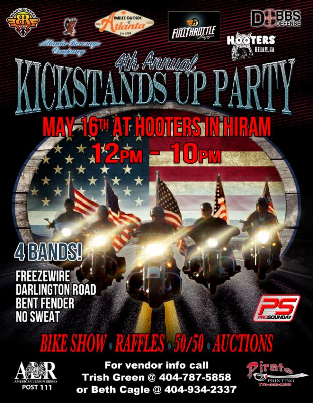 Apr. 11 Marietta, GA. Moon's Cancer Ride 4 Life. Sponsored by American Bikers Assoc. Benefits Moon Mullins & his fight 4 life. Register 10am at Hellbender H-D. $10 entry/$5 extra hands. Departs 12 noon for Cloud Springs Deli in Ringgold, GA where food, music and vendors await. Call Jean Davis 678-343-1725 or Sandie Gallion 770-688-4291.