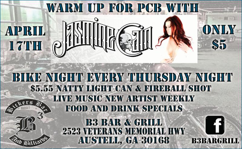 Apr. 17 Austell, GA. Jasmine Cain in Concert at B3 Bar & Grill. Warm up for PCB with Jasmine. $5 entry. 2523 Veterans Memorial Hwy.