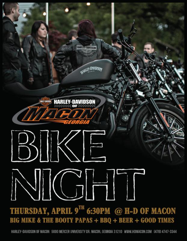 Apr. 9 Macon, GA. Harley-Davidson of Macon Bike Night. Featuring Big Mike and the Booty Papas. Starts 6pm with BBQ, Beer and good times. 5000 Mercer University Dr. Call 478-4747-3344 or visit www.hdmacon.com