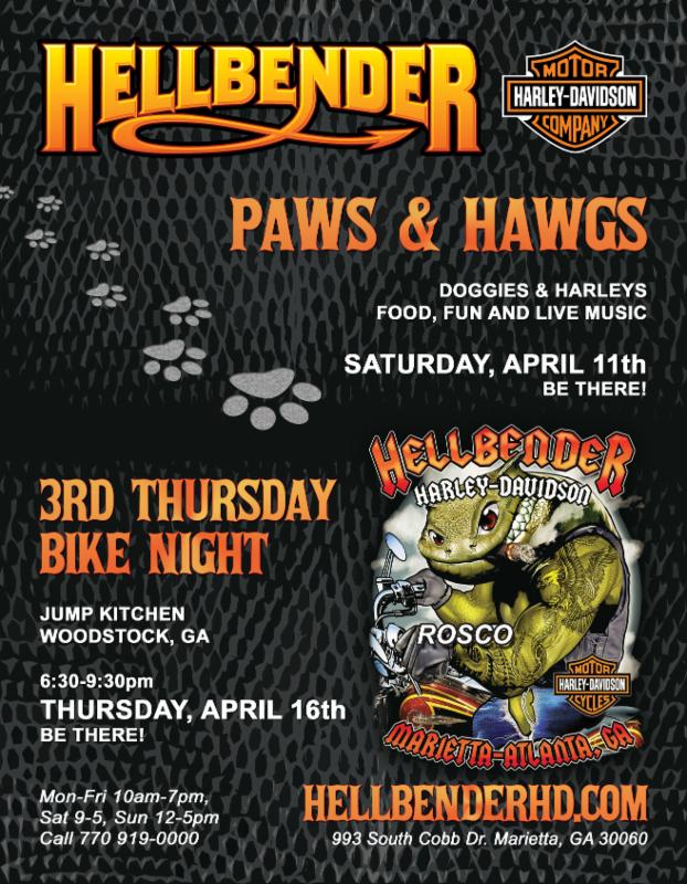Apr. 11 Marietta, GA. Paws & Hawgs at Hellbender Harley-Davidson. Doggies & Harleys, food and fun. Call 770-919-0000 or visit hellbenderhd.com.