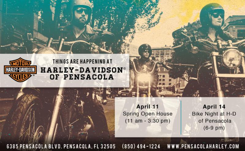 Apr. 11 Pensacola, FL. Spring Open House at Harley-Davidson of Pensacola. From 11am-3:30pm. 6385 Pensacola Blvd. Call 850-494-1224.