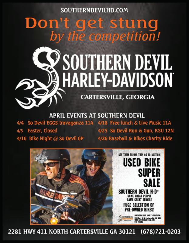 Apr. 16 Cartersville, GA. 3rd Thursday Bike Night at Southern Devil Harley-Davidson. 2281 Highway 411 NE. Call 888- 965-6342.
