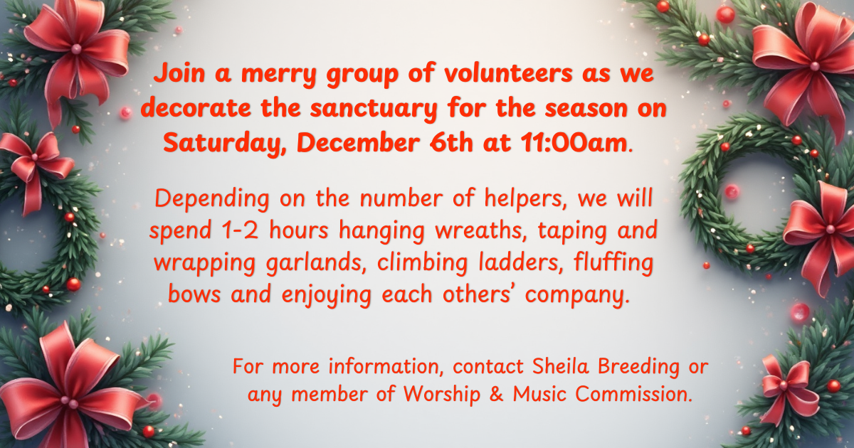 Prayer Shawl Ministry: The prayer shawl ministry meets on the second Wednesday of the month at the home of Kathy Hobbs. Contact her at kathyahobbs6@gmail.com with any questions or to participate. The next meeting will be December 10
