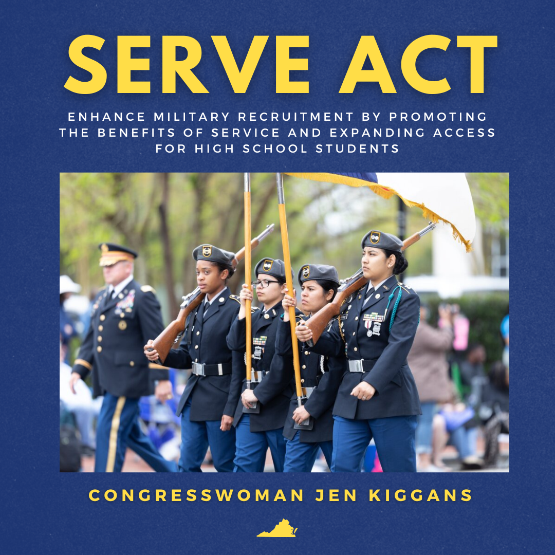On Wednesday, I teamed up with a bipartisan group of my colleagues in both the House and Senate to introduce the Service Enlistment and Recruitment of Valuable Engagement (SERVE) Act. This important legislation aims to enhance military recruitment by promoting the benefits of service and expanding access for high school students.