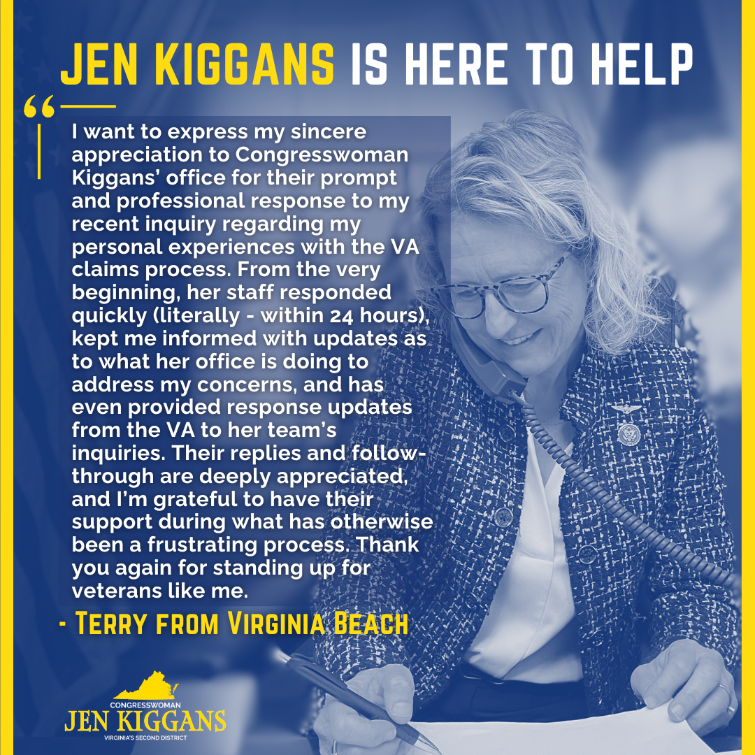 I know how difficult it can be to navigate the federal government. Recently, my office assisted Terry from Virginia Beach in resolving an issue he was having regarding his VA claims. After he reached out to my office, we were able to get him the help he needed. We are always here to help everyone in Virginia's Sceond District, especially our veterans. Thanks for reaching out, Terry...!