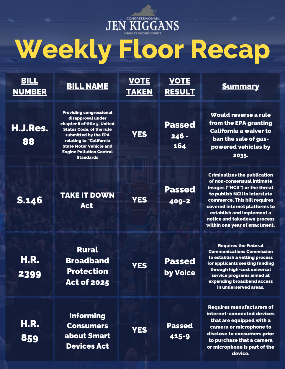 We also passed multiple pieces of important legislation in the House to roll back California's burdensome EV mandates, expand rural broadband access, and more. You can read more about what we passed below in my weekly floor recap...!