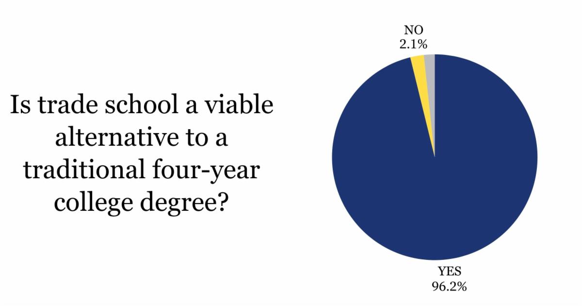 Last week, I asked, “Is trade school a viable alternative to a traditional four-year college degree?” With over 1,400 responses, the results spoke volumes. 96.2% said YES, 2.1% said NO, and 1.7% were UNSURE.