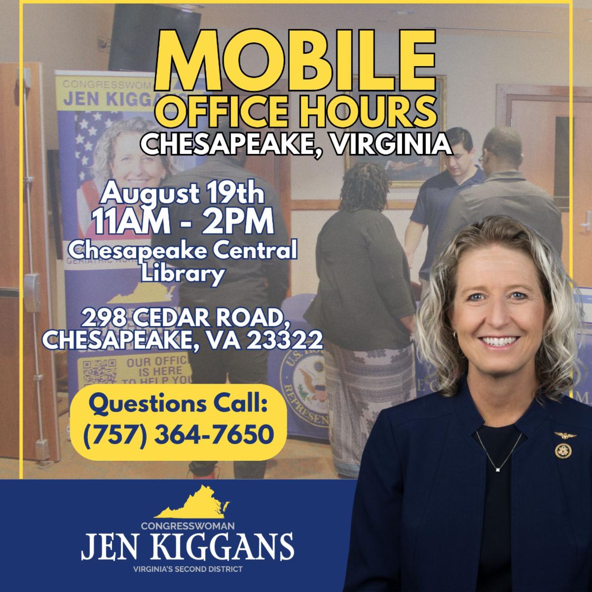 Team Kiggans is hitting the road again! My staff will be hosting Mobile Office Hours on Tuesday, August 19th from 11:00 AM to 2:00 PM at the Chesapeake Central Library (298 Cedar Road, Chesapeake, VA 23322).