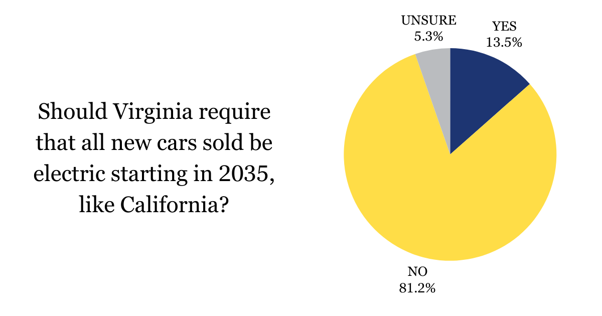 With over 1,100 votes last week, 81% of you said that you don't think that Virginia should require all new cars sold be electric starting in 2035. I agree with you, which is why I voted against the bill in 2021 when I served in the Virginia Senate. I'm grateful for Governor Youngkin's leadership on this important issue.