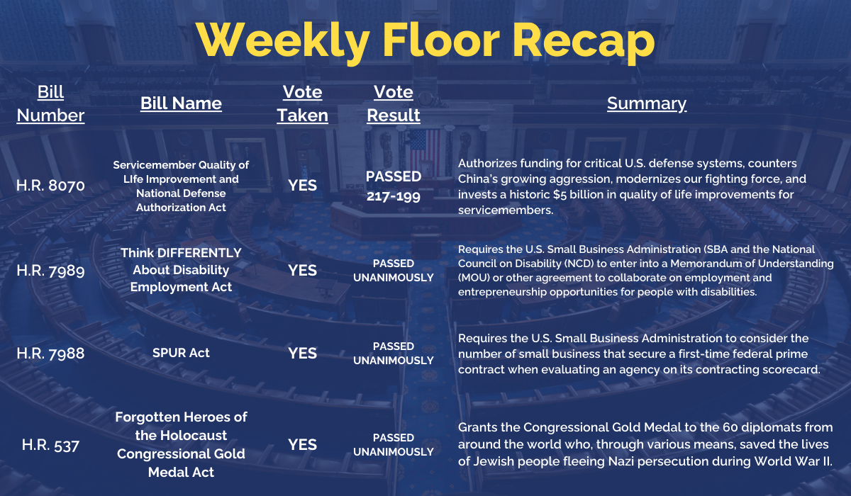 | Last week was a busy week in Washington. Throughout the week, we voted on several significant pieces of legislation, including the Servicemember Quality of Life Improvement and National Defense Authorization Act (NDAA), FY25, which authorizes critical U.S. defense systems, counters China's growing aggression, modernizes our fighting force, and invests a historic $5 billion in quality of life improvements for servicemembers. Additionally, we unanimously passed a resolution to award the Congressional Gold Medal to the Forgotten Heroes of the Holocaust. I was proud to vote in favor of these bills, and you can read more about them below: | | |